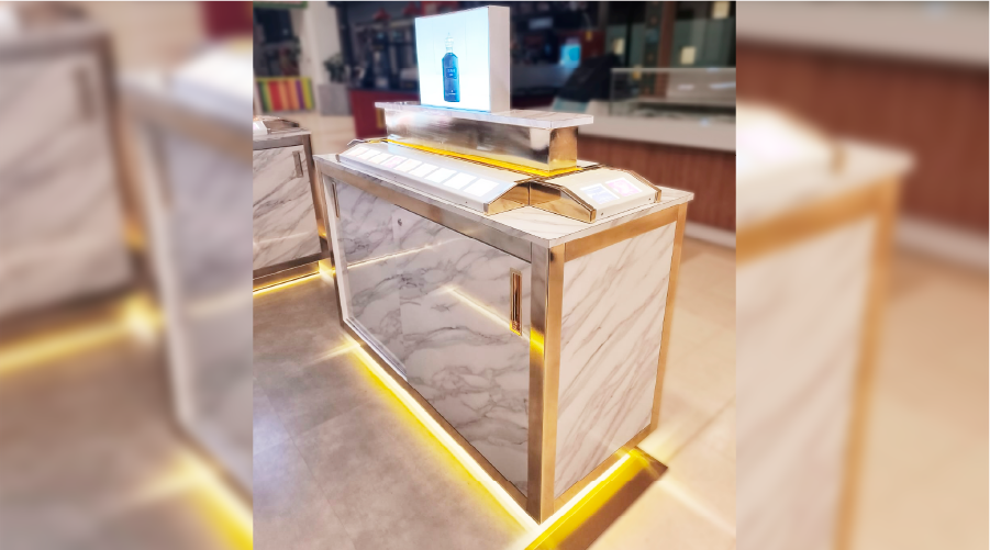 Fabricamos un mueble premium para DXB que redefine la forma de exhibir productos, combinando elegancia, funcionalidad y un diseño 100% personalizado. Esta pieza, construida con acabados tipo mármol, perfiles metálicos dorados e iluminación LED cálida, está pensada para destacar cada fragancia y convertir el punto de venta en un espacio sofisticado y memorable.